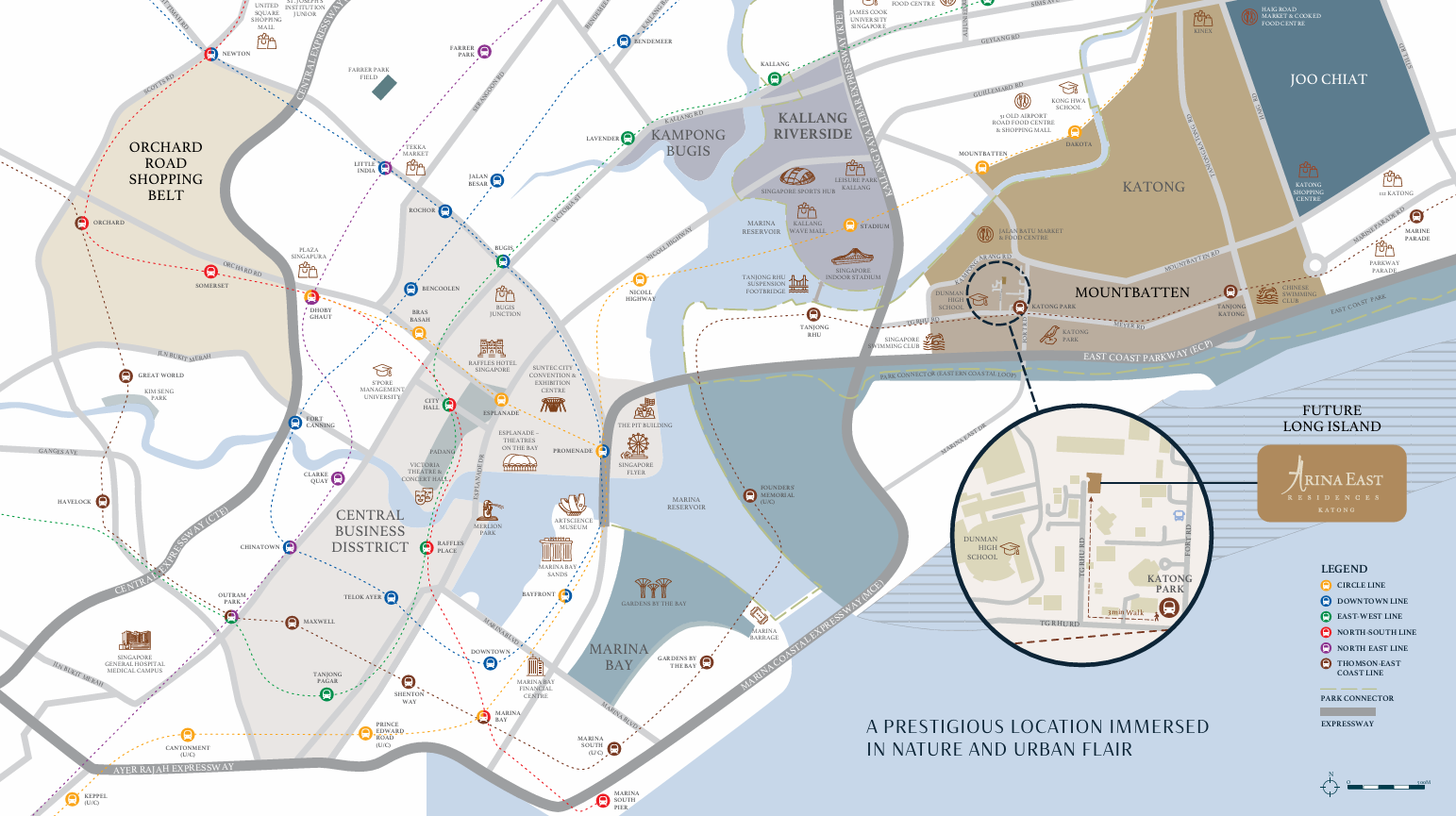 Arina East Location offers a rare opportunity to embrace the best of city-fringe living at Tanjong Rhu Road, in the highly coveted District 15. Arina East residents enjoys a prime address on Tanjong Rhu Road, a tranquil enclave that perfectly balances serene residential charm with seamless urban connectivity. Residents of Arina East are just a short stroll from Katong Park MRT Station, ensuring swift and effortless commutes to the CBD, Marina Bay, and beyond. For those who prefer to drive, Arina East Location are nearby East Coast Parkway(ECP), Pan Island Expressway(PIE), and Kallang-Paya Lebar Expressway(KPE), placing the rest of Singapore within easy reach.