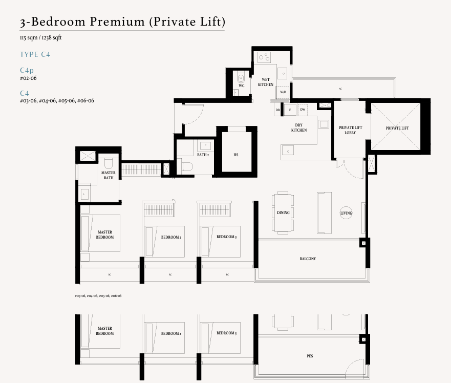 | 3 Bedroom Premium (Private Lift) | 5 | 1,238 | |